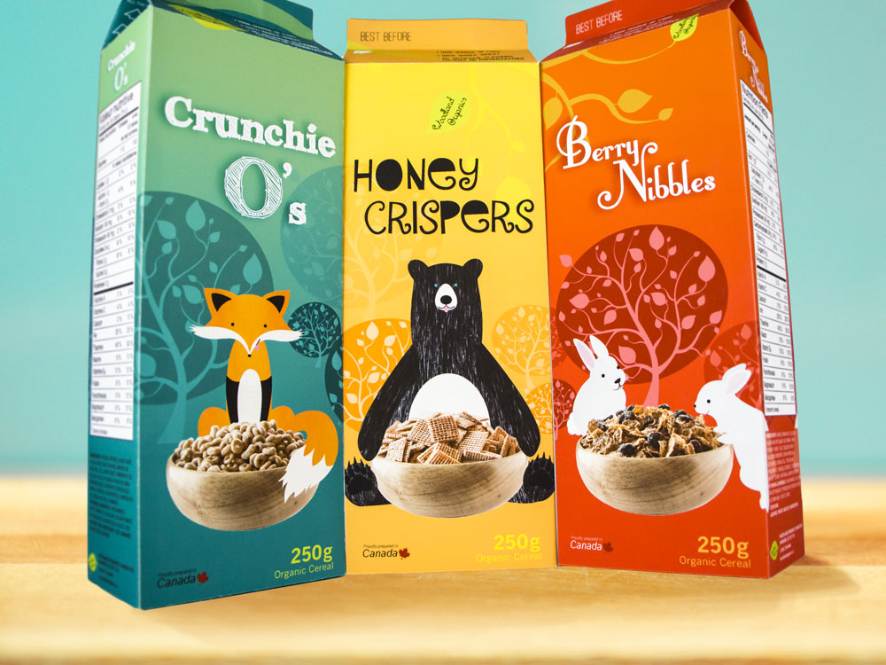 Here is my packaging design project for organic cereal for kids. I created all the characters in illustrator with various tools and textures. I wanted to create a series of cereals that have continuity and have a link to one another. The landscape behind the animals continues when all boxes are aligned, The trees in the background will line up as well as the tree branch incorporating the leaf logo across all the boxes when aligned, creating a nice visual presentation when sold all together as a unit.